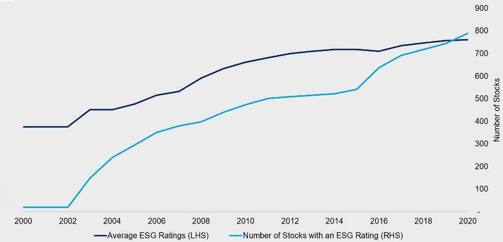 В начале 2000-х годов в США насчитывалось всего 20 компаний с ESG-рейтингом. Как видно по графику, к 2020 году их количество выросло почти до 800. Средний рейтинг ESG за 20 лет удвоился, что связывают с ростом объема, качества и доступности данных