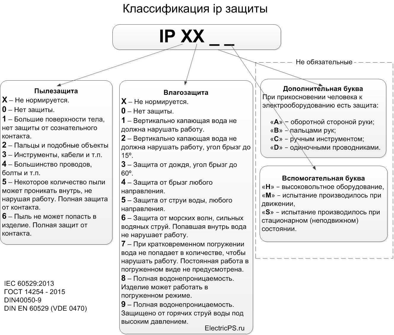 Существует специальная международная классификация корпусов электроприборов — Ingress Protection Rating (с английского — степень защиты от проникновения), которая соответствует всем международным и российским стандартам: IEC 60529, DIN 40050, ГОСТ 14254.
