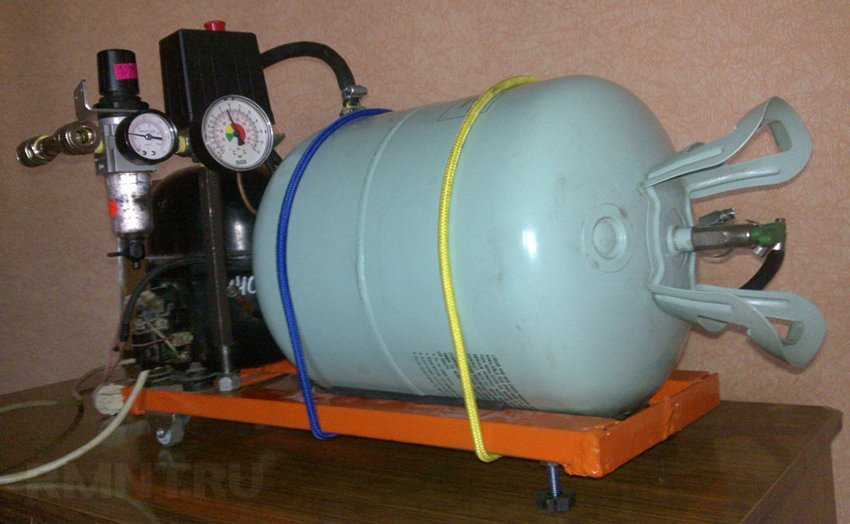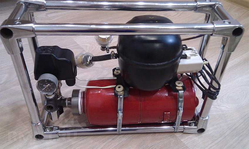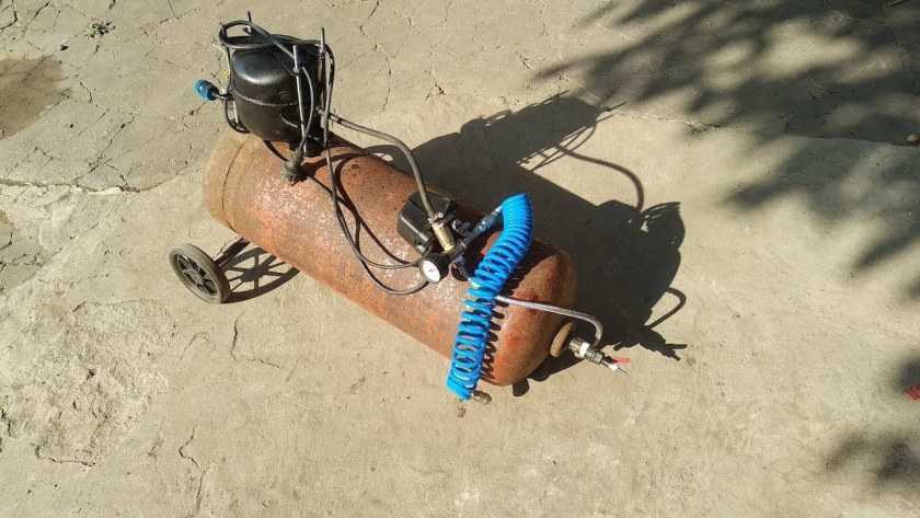 Народные умельцы давно научились делать компрессоры своими руками. Некоторые самостоятельно изготовленные приборы способны выполнять работу не хуже заводских. Как правило, в качестве ресиверов используются газовые баллоны или огнетушители. А роль нагнетательной машины исполняет компрессор от отслужившего холодильника.