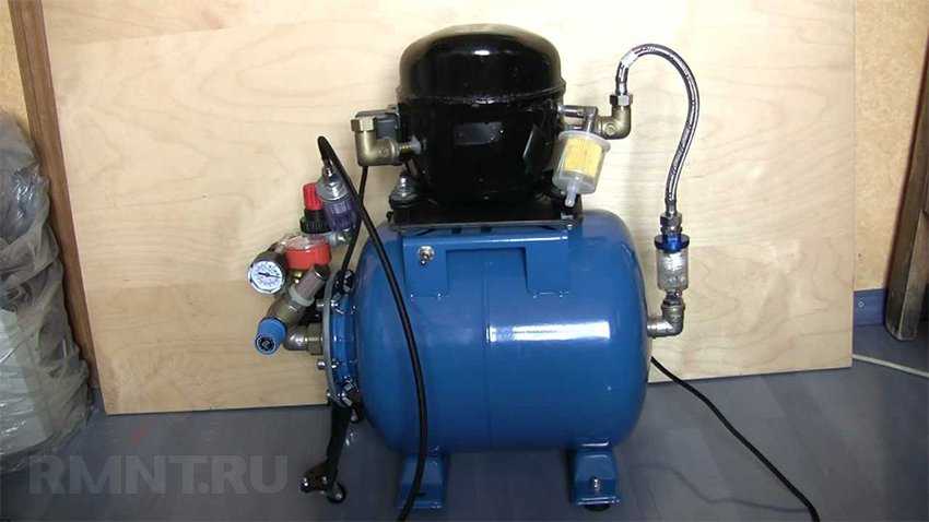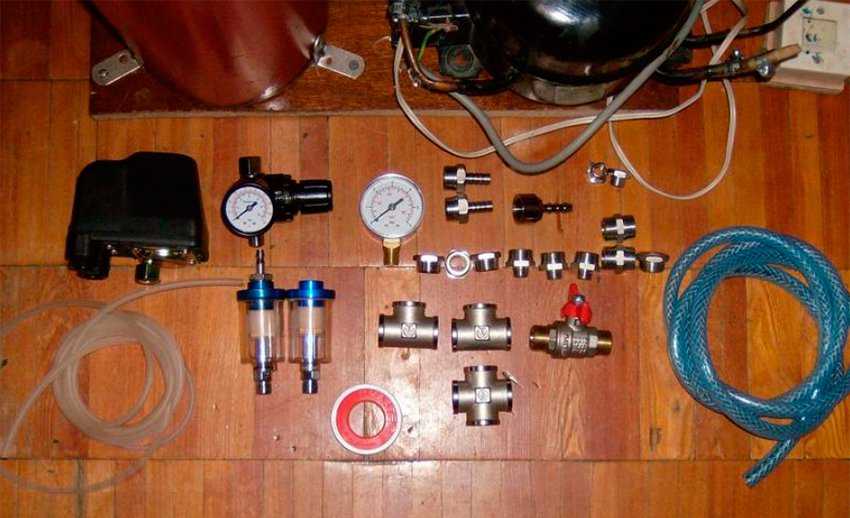В качестве основных элементов берутся: мотор-компрессор от холодильника (лучше производства СССР) и баллон огнетушителя, который будет использован в качестве ресивера. Если в наличии их нет, то компрессор от неработающего холодильника можно поискать в мастерских по ремонту или в пунктах приёма металла. Огнетушитель можно приобрести на вторичном рынке или привлечь к поискам знакомых, на работе у которых могут быть списанные ОХП, ОВП, ОУ на 10 л. Баллон огнетушителя должен быть безопасно опорожнён.