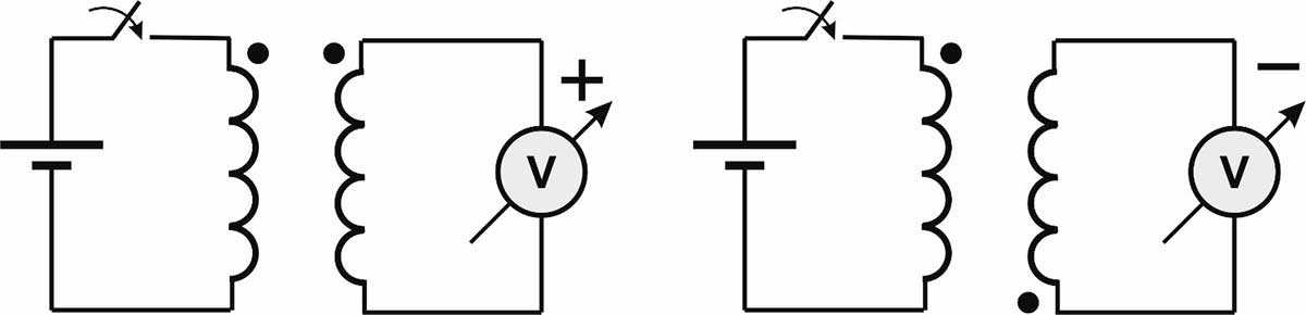 Справа показан случай встречного (в том числе по направлению генерируемого магнитного поля) включения, когда вольтметр показывает отрицательное напряжение.
