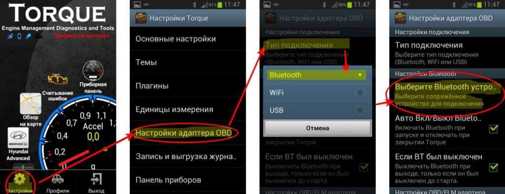 Адаптер подключается в разъём OBD-II в автомобиле. Затем сопрягается по Bluetooth и далее необходимо настроить профиль.