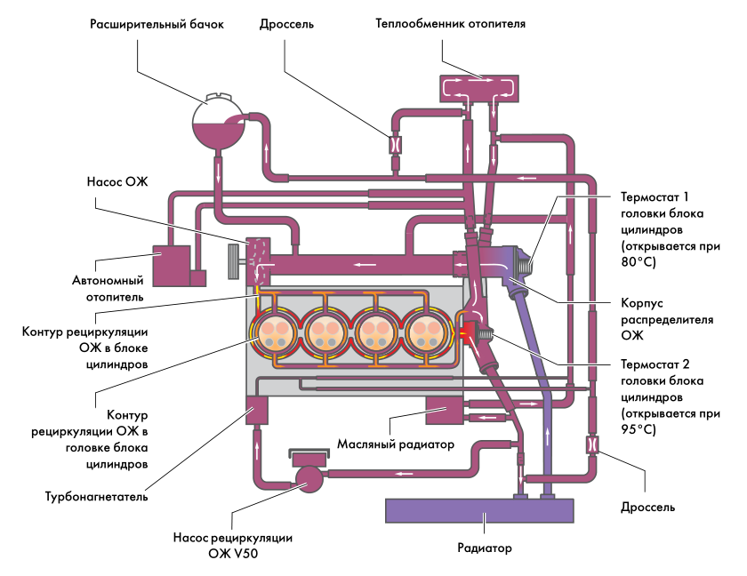 - Система охлаждения – двухконтурная, также регулирует температуру воздуха наддува. В версиях мощностью 122 л.с. и меньше – интеркулер жидкостного охлаждения;