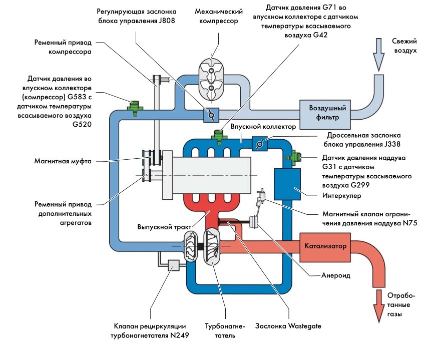 - Система двойного наддува с турбонагнетателем и механическим компрессором, который работает на низких оборотах (до 2400 об/мин), увеличивая крутящий момент. При частоте вращения двигателя чуть выше холостого хода нагнетатель с ременным приводом обеспечивает давления наддува в 1,2 бар. Максимальная эффективность турбокомпрессора достигается на средних оборотах. Применяется на модификациях двигателя с мощностью более 138 л.с.;