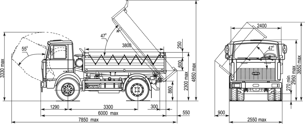 - Время подъёма груженого кузова – 15 сек, время опускания пустого кузова – 10 сек. Угол подъема кузова – 50 градусов.