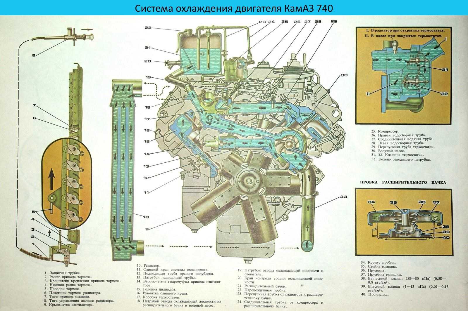 За охлаждение дизельного двигателя Камаз 740 отвечает жидкостная система закрытого типа с принудительной циркуляцией. Ее основные элементы: