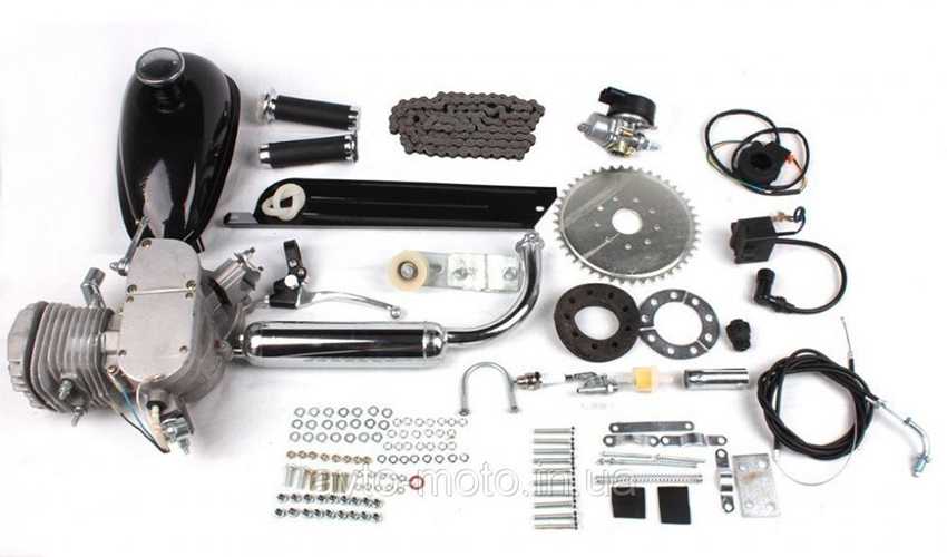 В комплект включено всё необходимое для установки двигателя на велосипед (двигатель, бензобак, бензокран, глушитель, модернизированный карбюратор, тросики, ручки руля, звезды, цепь, натяжитель цепи, электрооборудование, крепеж)