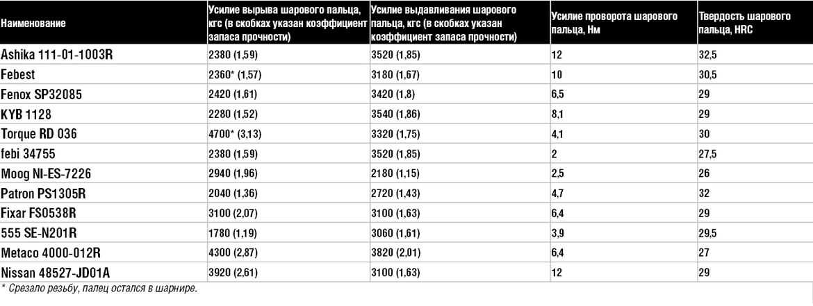 Все испытания деталей проводились в лаборатории ООО «НПО „Талис“». Минимально допустимые значения силы вырыва и силы выдавливания пальца из корпуса шарнира указаны в «Приложении А» к ГОСТу в зависимости от диаметра шарового пальца. В данном случае все представленные рулевые наконечники имеют диаметр шара пальца 22 мм. При таком диаметре минимальное усилие на вырыв шарового пальца составляет 1500 кгс, на выдавливание — 1900 кгс.