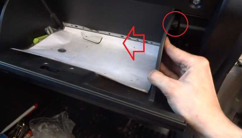 Теперь необходимо вытащить бардачек из приборной панели. Слева и справа он держится на защелках. Нажимаем на гибкие стенки бардачка, чтобы извлечь его, как на фото.