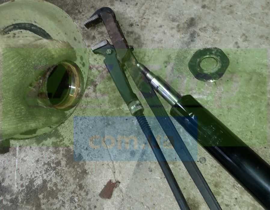 - Откручиваем крышку стойки. Для этого нужно стойку зафиксировать в тисках. Саму крышку удастся выкрутить только трубным ключом.