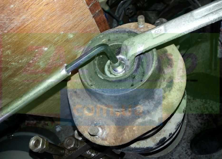 - Возьмите ключ, для удержания штока амортизатора от возможного проворачивания, в это время, используя второй ключ, отверните гайку, закрепляющую верхнюю часть амортизатора.