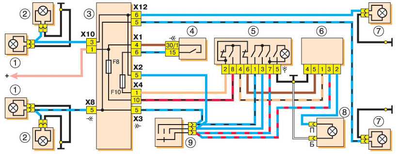 Для наглядности представим схему указателей поворотов и аварийки для семерки. В нее входят: