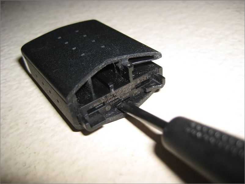 Вставьте в эту выемку в корпусе ключа плоскую отвертку и осторожно разъедините две половинки брелока. Вытащите из ключа старую батарею кончиком пальцев или переверните половинку ключа с батарейкой, и осторожно нажмите на корпус брелока пока батарейка не выпадет из ключа