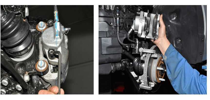 Сняв суппорт, можно извлечь старые колодки, запомнив расположение выступа «датчика износа». Если на новых колодках датчика нет, его стоит снять со старых колодок и установить на новые. Далее стоит проверить/заменить пыльники и смазать направляющие. Также можно почистить тормозной диск и суппорт, используя очиститель тормозных механизмов.