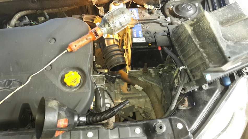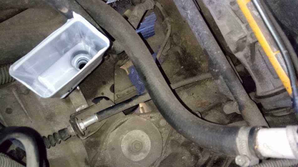 После снятия крышки со сливного отверстия трансмиссии автомобилист должен подставить под него пустой резервуар объёмом 5 л., что поможет вместить всю выходящую отработку. Оптимизировать процесс поможет демонтаж пробки контрольного отверстия. Вытащив щуп, автовладелец снизит давление в конструкции. Иногда на этом этапе требуется демонтаж корпуса воздушного фильтра.