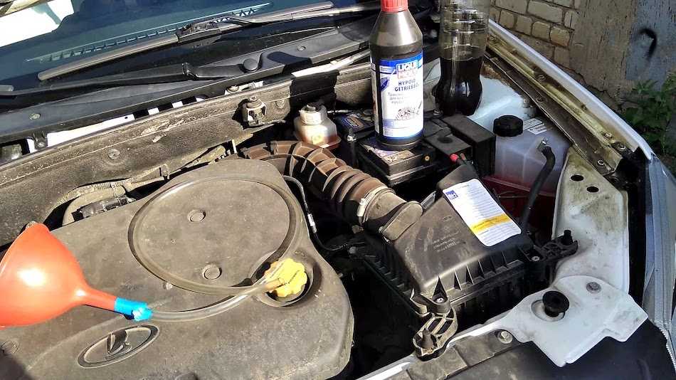 После полного слива смазки нужно проверить её состояние, о нормально функционирующем веществе должны сказать светлый цвет, запах гари, отсутствие примесей и мусора. Если есть какие-то осложнения, конструкцию нужно чистить. При закрытом заливном отверстии в агрегат заливают специальное средство. Очистителей на современном рынке множество, можно выбрать любое по своим возможностям. Для очистки понадобится около 1,5 л. вещества. Как только жидкость поступит в агрегат, переднюю часть транспортного средства следует расположить таким образом, чтобы колёса приподнялись, сделать это можно посредством домкрата. При активированном силовом агрегате включается первая скорость, мягким воздействием на педаль газа нужно ехать пару минут. Следующий шаг — повторный слив вещества. При сильном загрязнении процедура повторяется.