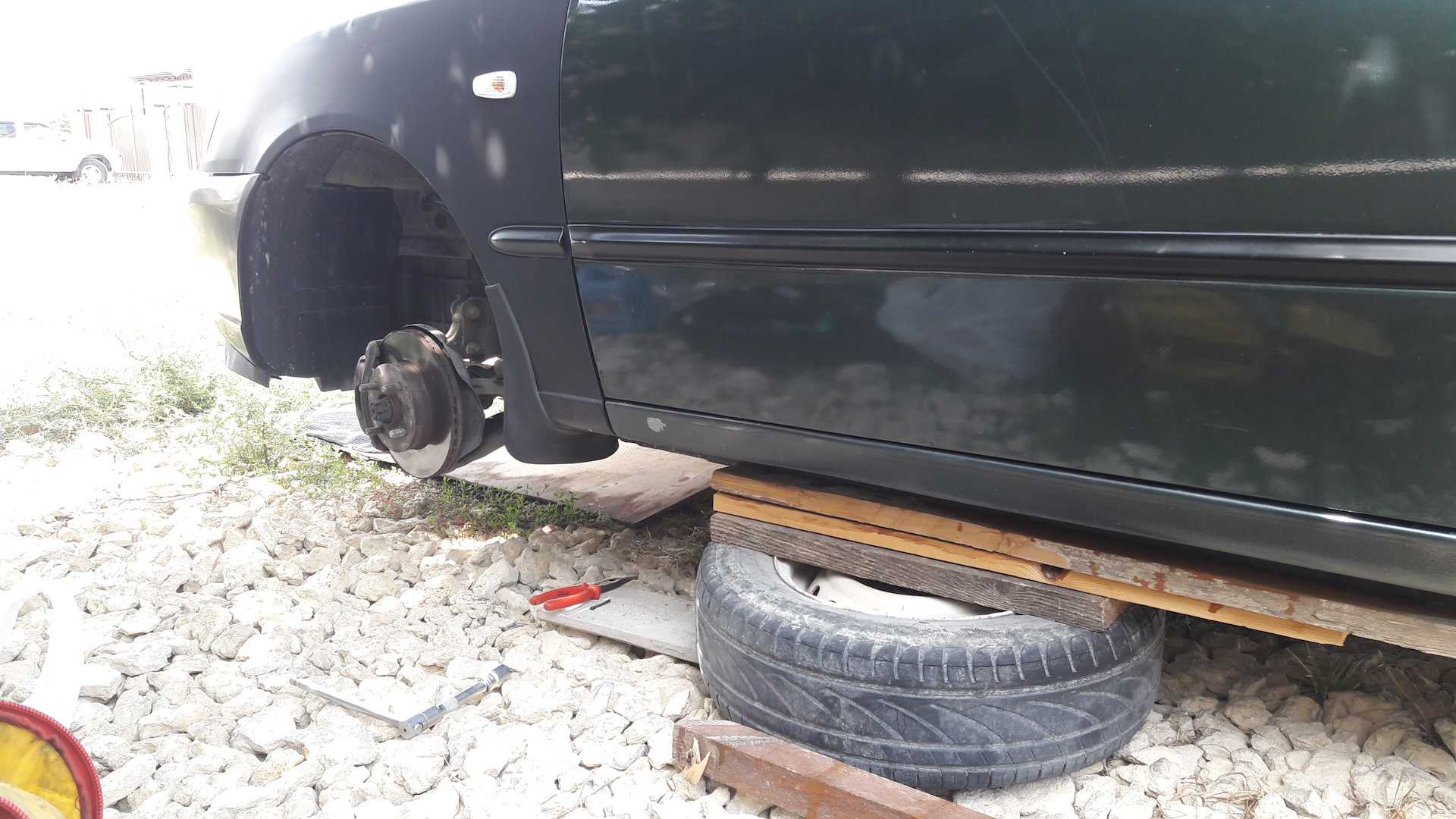 В идеале не нужно оставлять автомобиль на домкрате, лучше поместить под него какую-то опору. Для этого вполне сгодится и снятое колесо. Далее, разберем замену обоих ШРУСов.