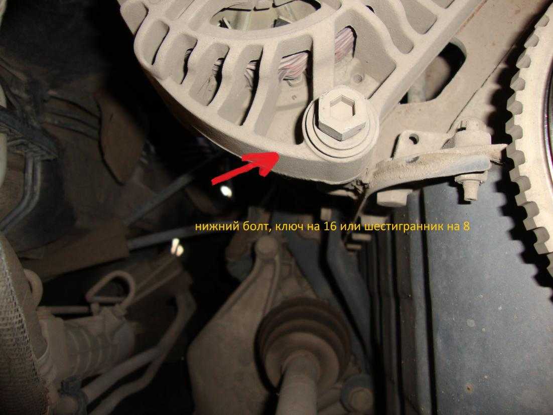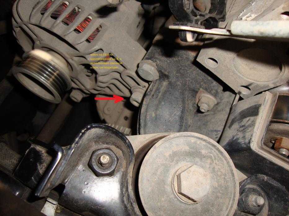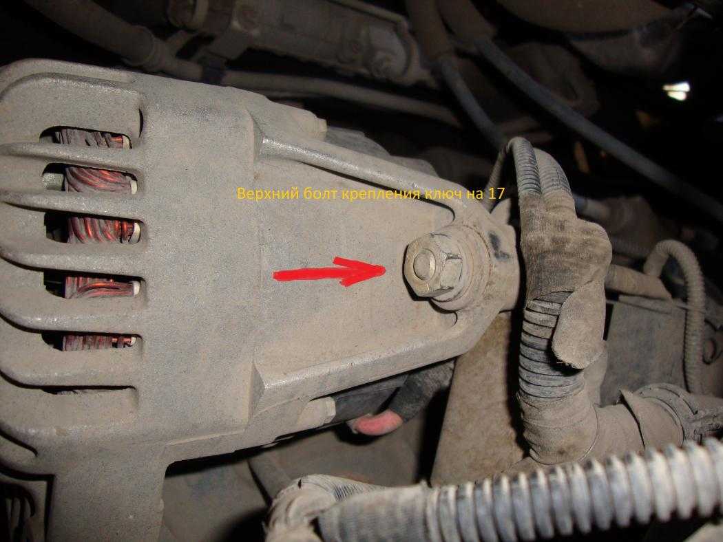 Для владельце в автомобиля в комплектации «база», чтоб снять приводной ремень ремень навесного оборудования необходимо проделать следующие операции: ключом на 16 или шестигранником на 8 ослабляем нижний и натяжной болты (на фото указан стрелкой), ключом на 17 ослабляем верхний задний болт крепления генератора и снимаем ремень.