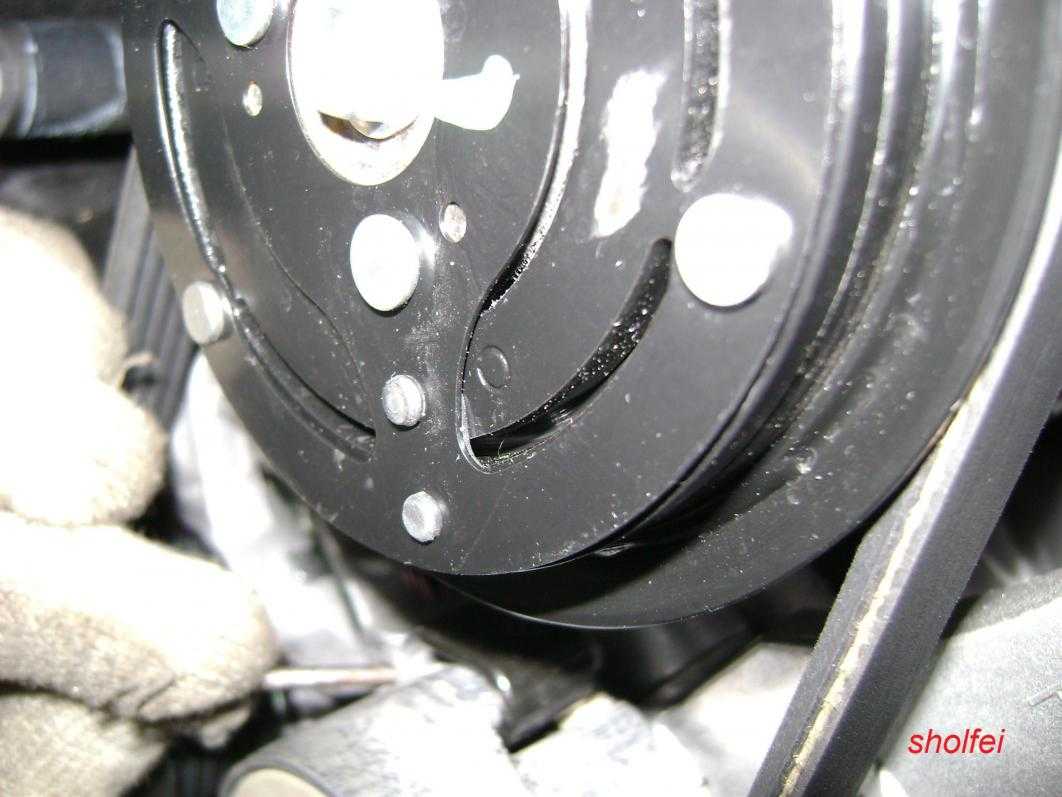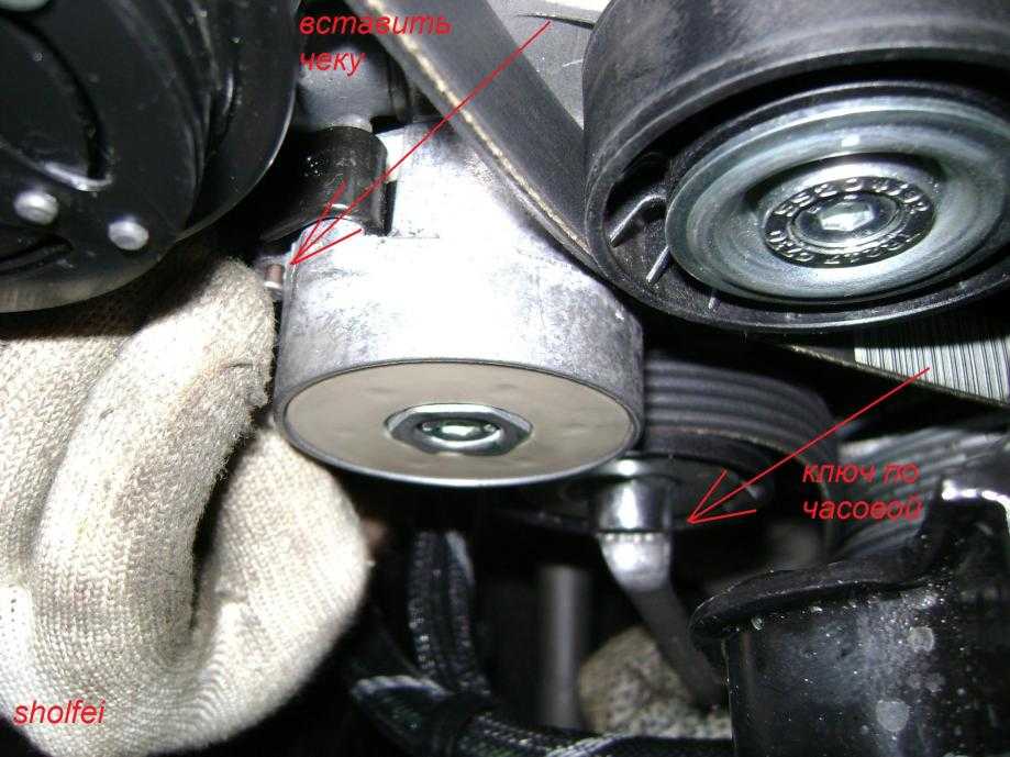 Накидным ключом на 13*17 за болт крепления ролика оттягиваем по часовой стрелке натяжной механизм и снимаем приводной ремень, отводим его в сторону чтоб не мешал. Сверху в корпусе натяжного механизма имеется отверстие для установки стопора, можно в отведённом состоянии вставить туда подходящего диаметра гвоздь или болт, тогда механизм будет зафиксирован в отведённом состоянии что облегчит работу по снятию и последующему одеванию приводного ремня.