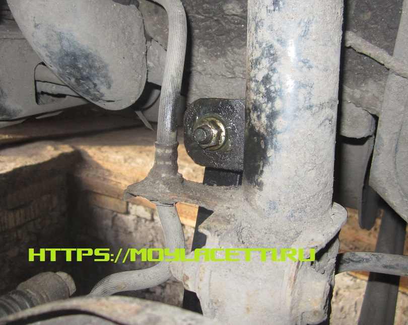 С верхним креплением разобрались. А с нижним не всё так просто. Вернее, при наличии смотровой ямы, проблем никаких, а вот без ямы и когда авто на домкрате, мы увидим следующую картину