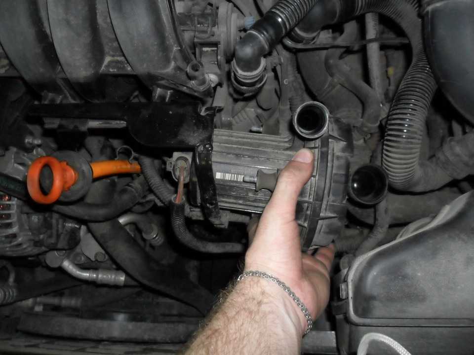 3) Снимите воздухозаборный насос. Он держится на саморезах и гайках, всех их надо открутить. При желании можно демонтировать питание и вовсе вытащить его из подкапотного пространства, но можно ограничиться и тем, что оставить его висеть, просто опустив вниз.
