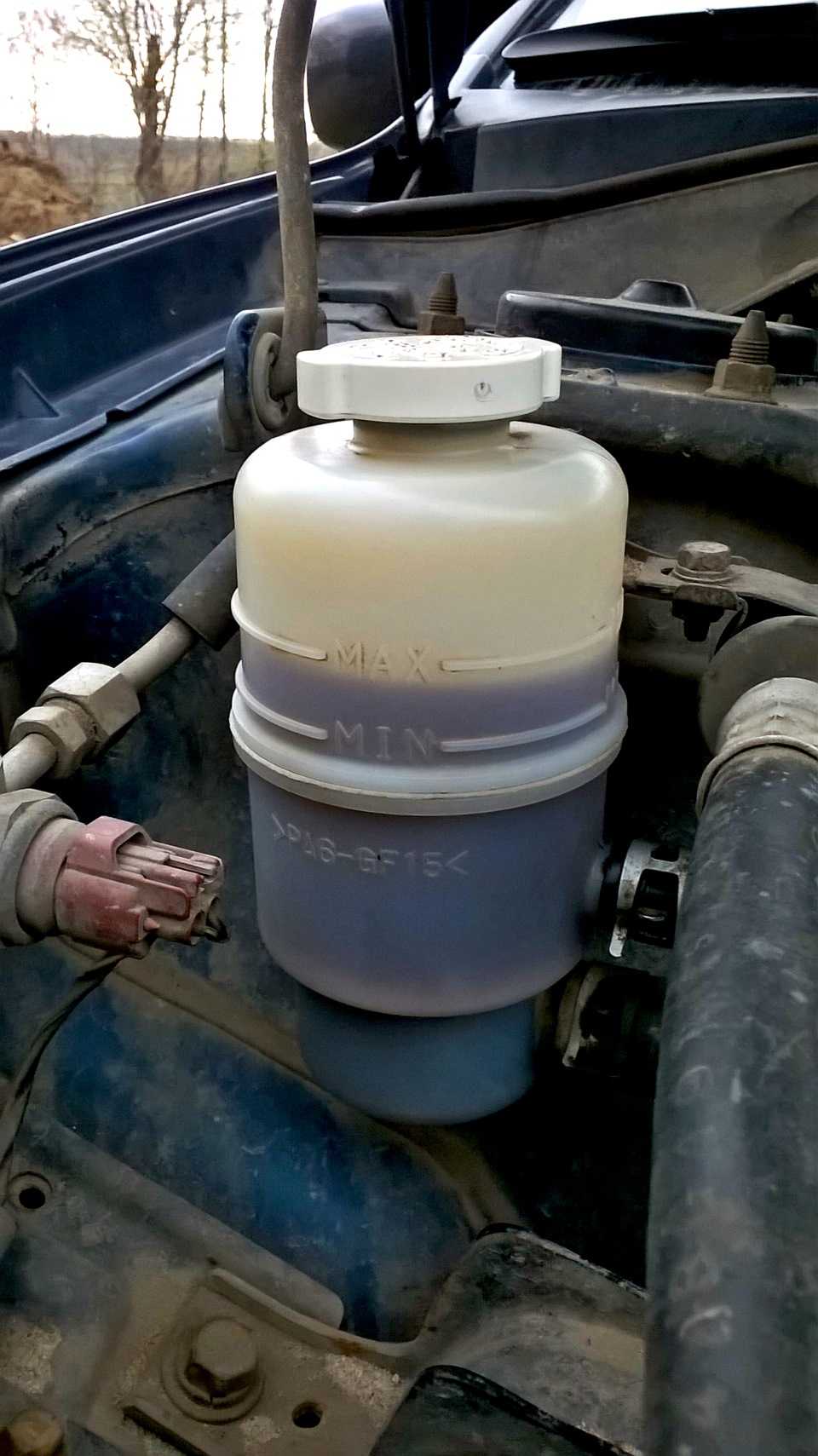Первый делом откачиваем старую жидкость из расширительного бачка (расположен справа по ходу движения). Внизу бочка стоит сетка, поэтому полностью масло гур не откачивается.