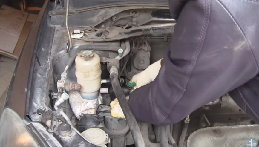 Следим на состоянием уровня жидкости в бачке. Старая жидкость через обратку будет поступать в нашу пластиковую бутылку, а новая будет заходить в систему. Как только из шланга обратки пойдет чистая жидкость замена завершена.
