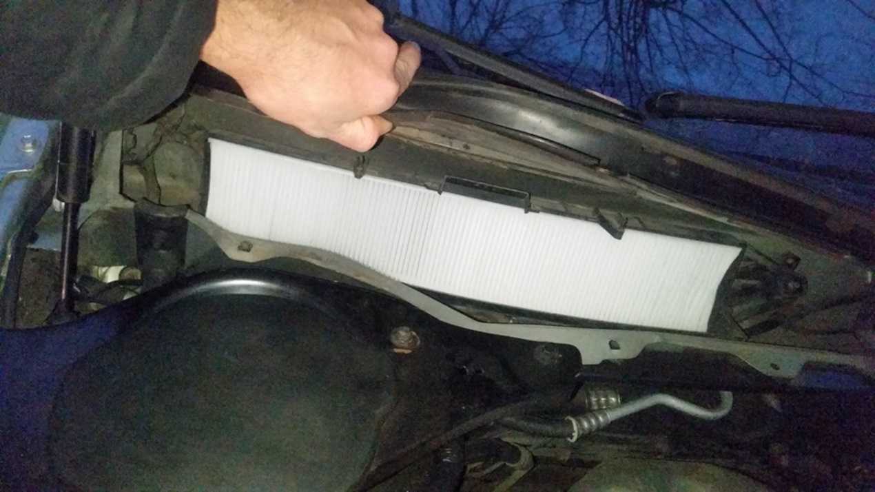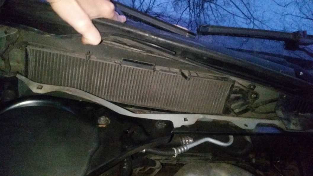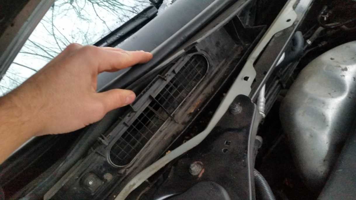 Для замены фильтра нам придется демонтировать поводки обоих дворников, защитных панелей из-под лобового стекла, а так-же кронштейн который их крепит к стеклу.